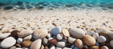 Smooth pebbles rest along a tranquil beach, kissed by gentle ocean waves and glimmering sunlight. A perfect scene of serenity and nature.