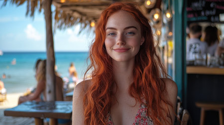Relaxed Redhead Supermodel at a Beach Café with Ocean View