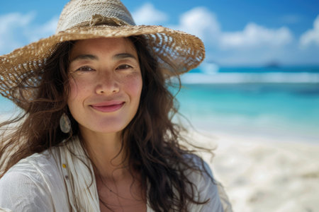 portrait of happy Japanese woman relaxing on Okinawa beach. ai generated
