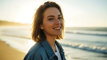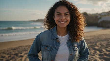 Smiling woman with curly hair poses happily on sandy beach during golden hour by the ocean waves