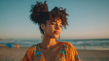 Beautiful african american woman with curly hair on the beach