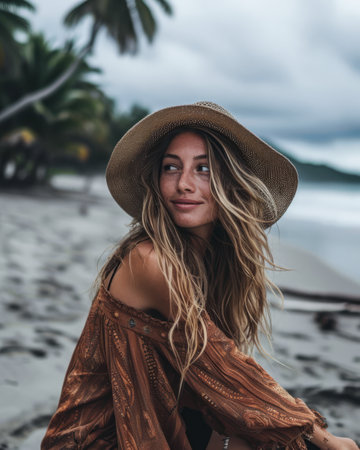 Portrait of a beautiful young woman with curly hair on the beach