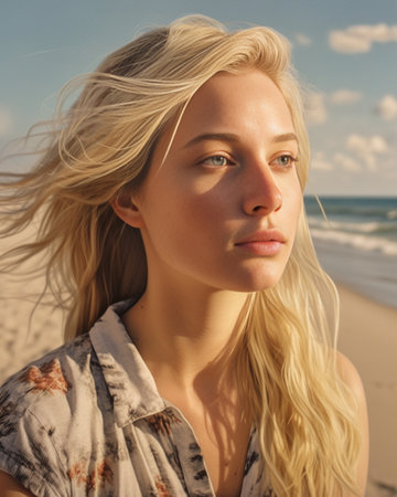 A serene moment captured on a beach at sunset, where a woman stands with the wind gently blowing through her hair, and the peaceful ocean in the background