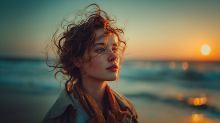 Captivating Sunset Serenity Portrait of a Radiant Tousled Haired Woman Gazing at the Ocean at Sunset Serene and Emotive Beach Lifestyle Imagery