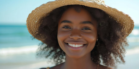 Close up portrait of beautiful african american woman in straw hat smiling at camera while sunbathingchair at tropical beach