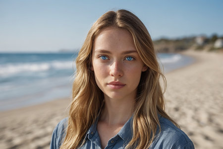 Portrait of a beautiful young woman with blue eyes on the beach