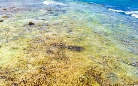 Tropical mexican caribbean beach landscape panorama with corals stones boulders rocks and clear turquoise blue water in Playa del Carmen Mexico.
