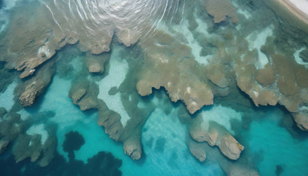 Stunning aerial view captures rocky coral reefs in crystal-clear turquoise water, showcasing the beauty and serenity of a vibrant marine ecosystem and landscape.
