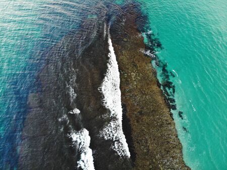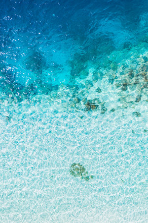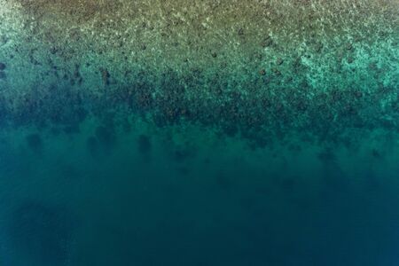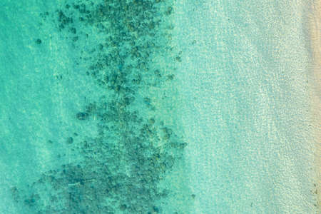 Aerial top view of clear turquoise ocean water with reefs. Nature summer background