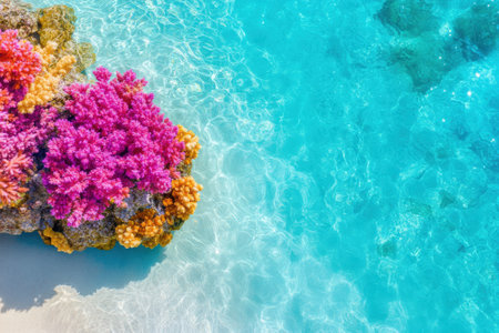 Vibrant coral reefs exhibit a stunning array of colors in clear shallow water illuminated by sunlight filtering through the surface showing the beauty of marine life.