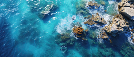 This stunning aerial image showcases the beauty of clear blue ocean water with vibrant coral reefs and rocky shorelines, perfect for travel themes.