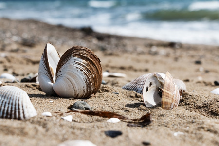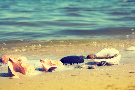 The shells and stones on the seashore. Sandy beach in sunny day. Toned and processing photos with soft selective focus.