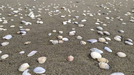 Top view of seashells lying in the sand. Seashell background. Shells on the sandy beach.