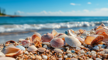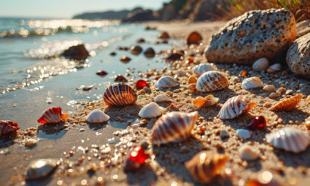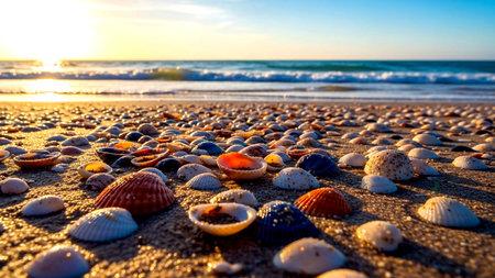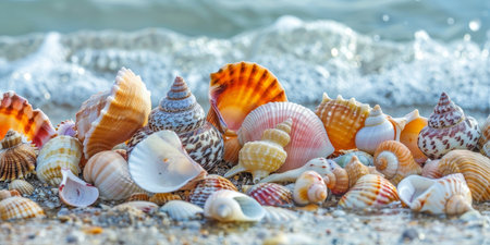 Discover a captivating scene of colorful seashells scattered on sandy shores, gently kissed by the waves. The vibrant hues and sparkling sunlight create a tranquil beach environment.