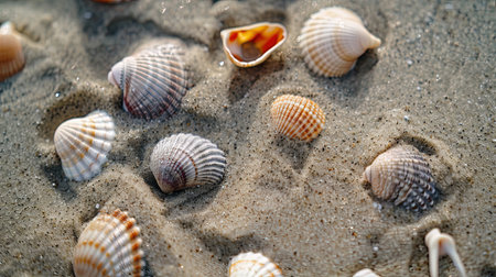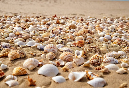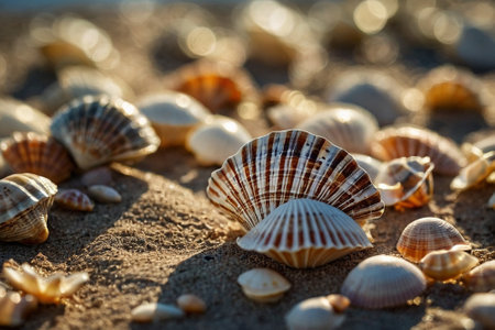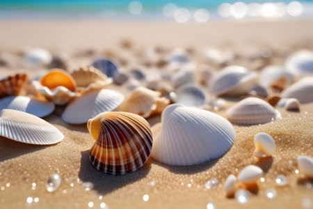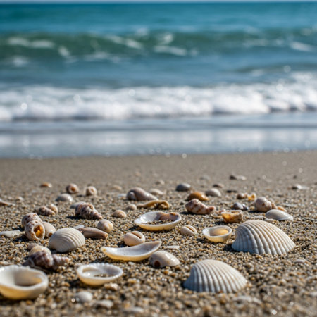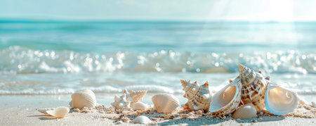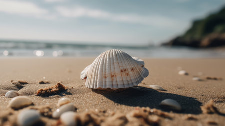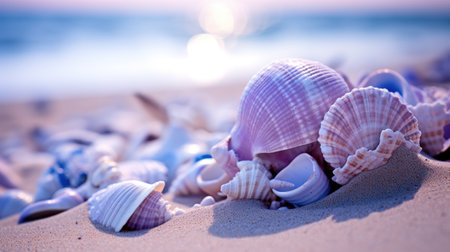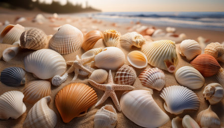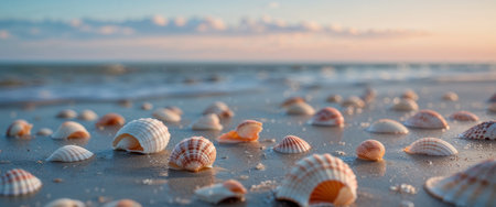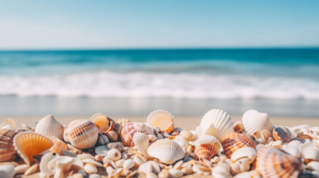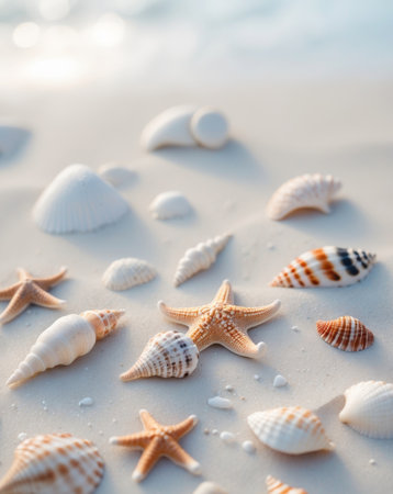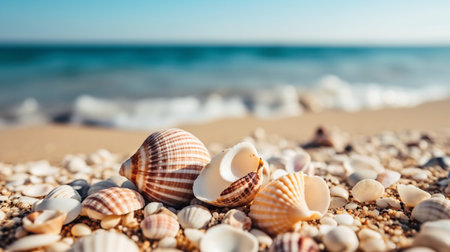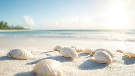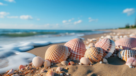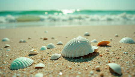 Seashells scattered on a serene beach with soft sand and gentle waves in the background, capturing the peaceful essence of a coastal environment. ideal for themes of relaxation, holidays, and natural beauty.