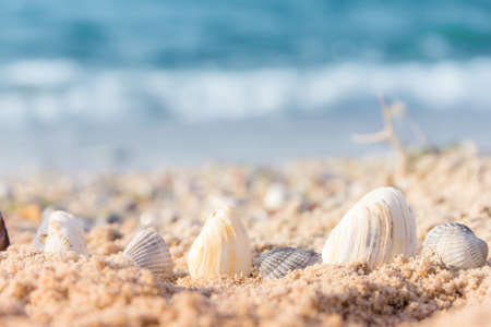 Seashells on the beach in the early morning. Selective focus.