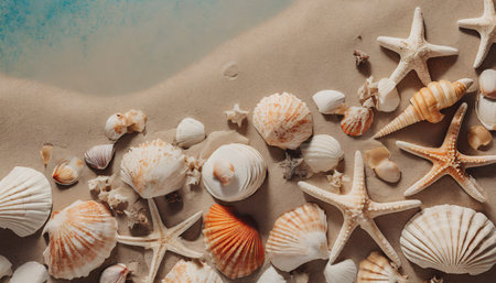 top view of a sandy beach with collection of seashells and starfish as natural textured background for aesthetic summer design