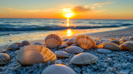 A breathtaking view of a sunset casting vibrant colors over the ocean, highlighting beautiful shells scattered on soft sandy beach, invoking peace and tranquility.