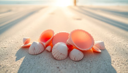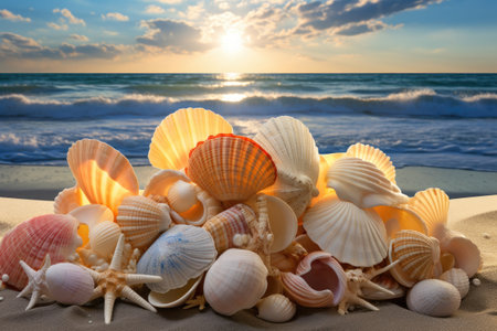 Sea shells on the beach at sunset, AI