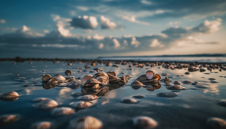 AI Generated. Serene Coastal View with Seashells on Wet Sand at Dusk