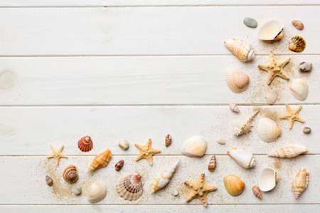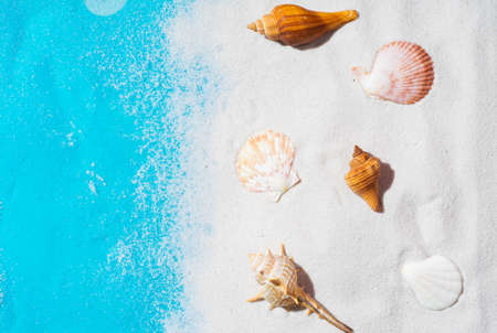 Seashells on the beach. Summer vacation concept background.