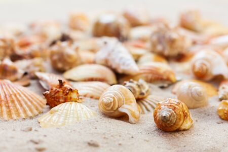 Seashells on the beach. Summer background. Selective focus.