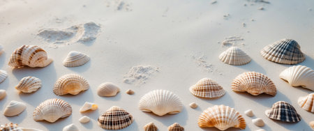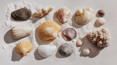 A flatlay arrangement of various seashells displayed on soft white sand, featuring diverse shapes, textures, and natural hues. This beach-themed image evokes a coastal vibe, perfect for summer, nature, travel, and vacation concepts in editorial or decorative use.