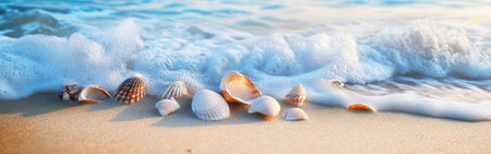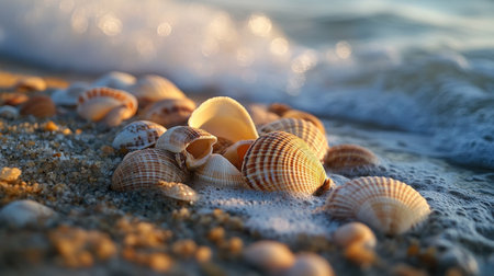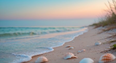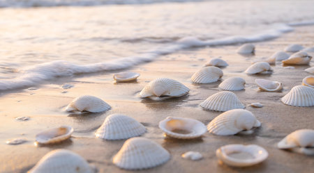 Delicate seashells rest on the warm sand, touched by gentle waves at sunrise. The peaceful scene captures the serenity of a coastal morning by the ocean.
