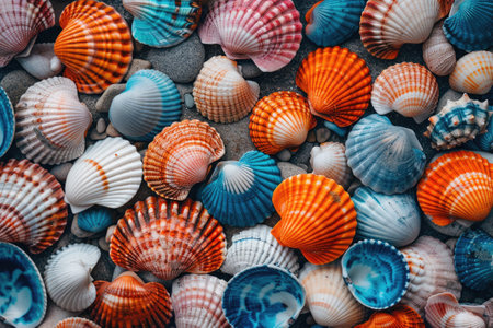 Assortment of vibrant seashells in various shades of blue, orange, and white, highlighting their intricate patterns and natural beauty, lying closely together.