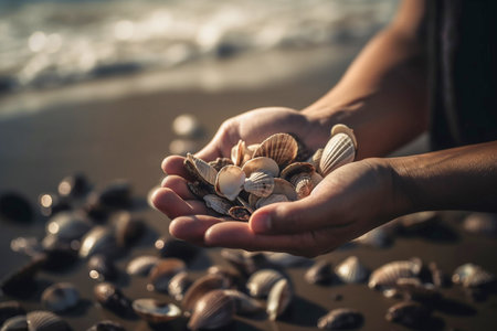 Woman holding sea shells in the palms, Generative AI