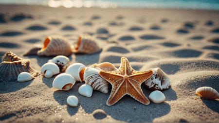 Seashells and starfish on a sandy beach at sunset