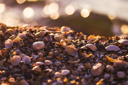 Seashells on the beach at sunset. Beautiful seascape.
