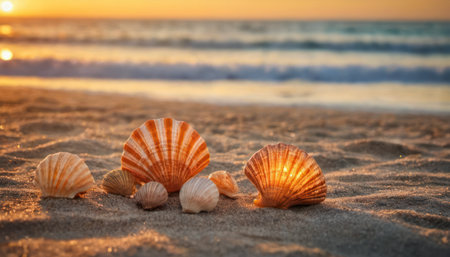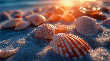 Delicate seashells of various shapes and colors lie on soft sand, illuminated by the warm glow of the sunset, creating a serene coastal atmosphere.