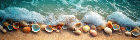 Serene ocean background with calm waves, sandy shores, and textured seashells. The tranquil, natural scene creates a peaceful, relaxing atmosphere, perfect for coastal or vacation themes