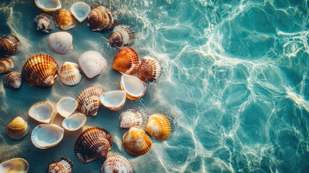 A stunning collection of vibrant seashells scattered on a sandy beach, complemented by clear turquoise water reflecting sunlight, showcasing nature's beauty and tranquility.