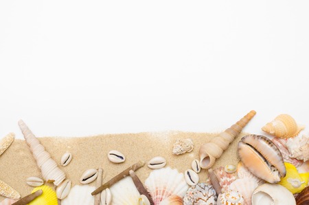 Sandy beach with seashells. Summer beach background.