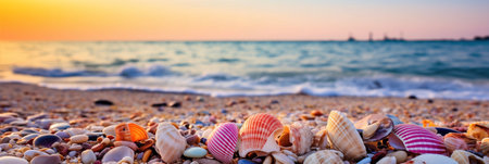Seashells on the beach at sunset. Summer vacation background