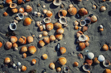 the sea coast with seashells, half in the sand