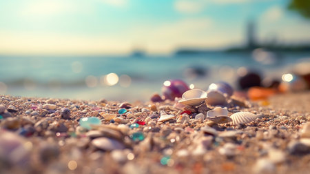A vibrant arrangement of colorful seashells and smooth pebbles on the beach with sparkling water in the background. Perfect for summer or nature themes.