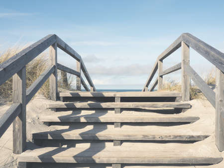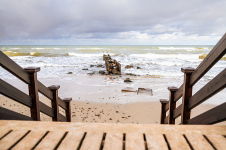 Wooden stairs leading to the beach viewed from the top of the cliff. Baltic sea shoreline in Debina, Poland