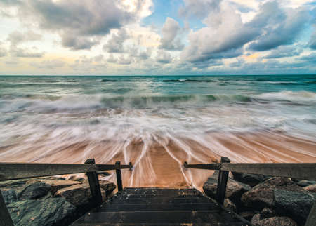 Wooden stairs leading to the sea at sunset. Beautiful seascape.