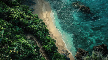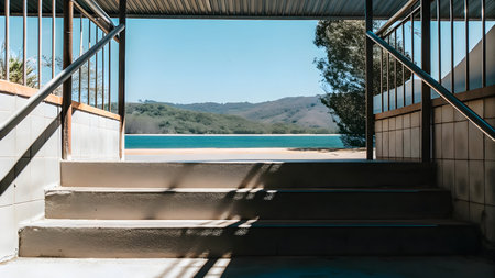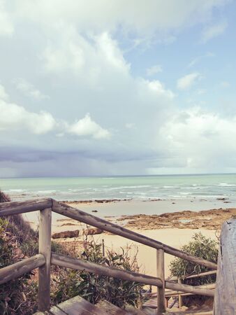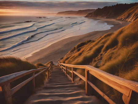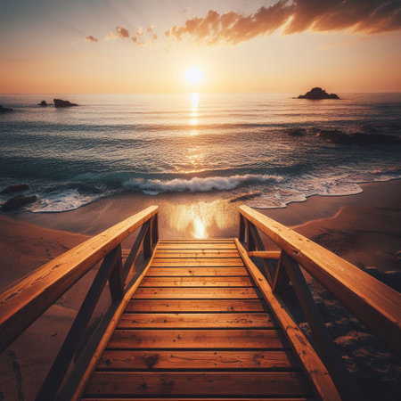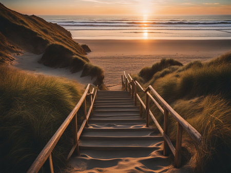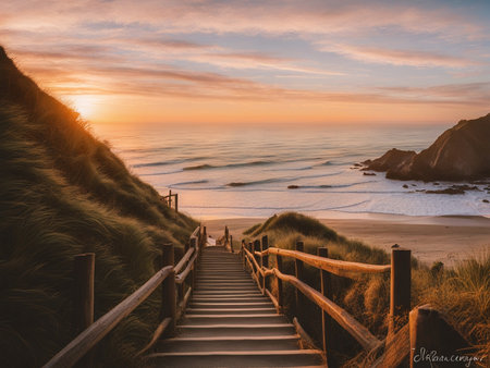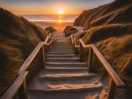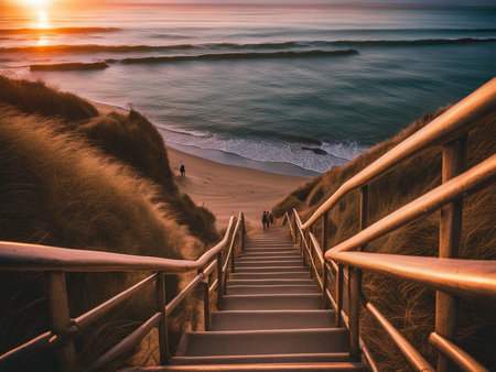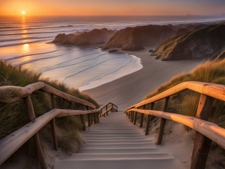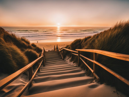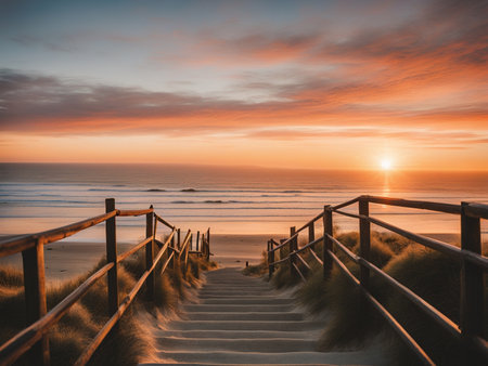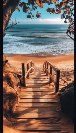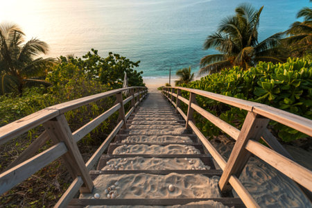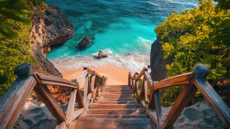 An inviting coastal scene unfolds, showcasing a wooden staircase descending onto a sandy beach. Turquoise ocean water meets the shore with gentle waves. The composition features a natural outdoor setting, suggesting a calm atmosphere. This image is suitable for various commercial uses, including travel and leisure content.
