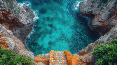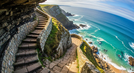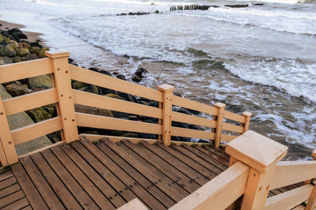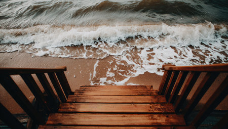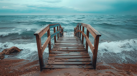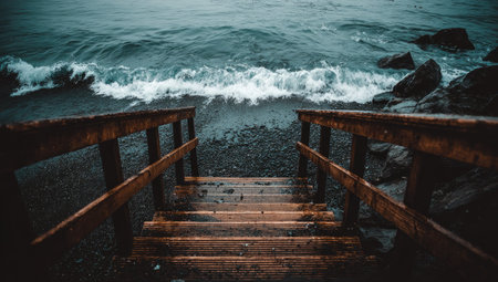 An image captures wooden stairs descending towards an ocean. The scene is dominated by shades of blue and brown, showcasing the waves meeting the rocky shoreline. The style is naturalistic. This image is suitable for various commercial purposes such as website design, and editorial content.