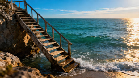 Weathered brown wood staircase anchored to textured rock, contrasting vibrant blue sea and dazzling golden sunlight reflections on ocean waves crashing below.