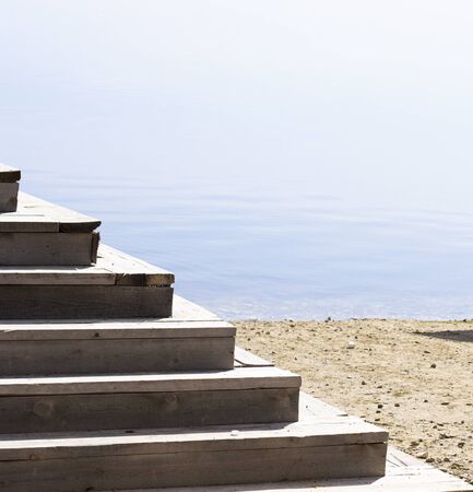Old wooden staircase on the background of water, side view. The concept of the career ladder