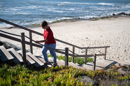 An elderly man walks down the stairs to the Atlantic Ocean, Cascais, Portugal