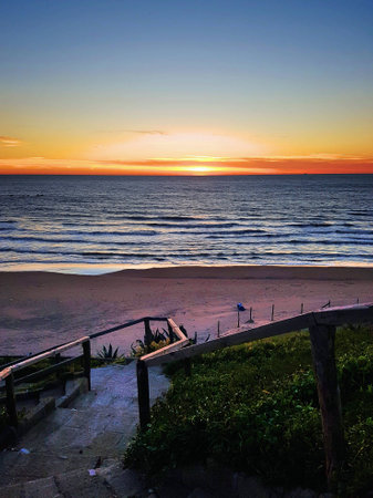 Long exposure of stairs leading to the ocean and beach at sunset in BR