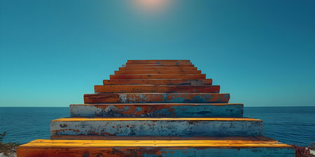 Wooden stairs leading up to a blue sky symbolizing business promotion and startup success. Concept Success Stories, Business Promotion, Career Growth, Startup Strategies, Wooden Stairs