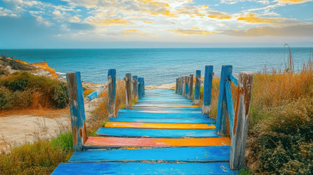 A vibrant wooden pathway in bright colors leads down to a serene ocean, framed by lush grass under a stunning sunset sky. Ideal for travel themes.