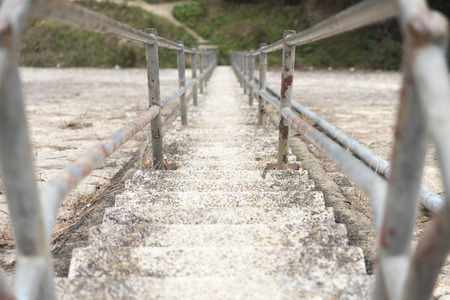 Concrete stairway old fishing port's with barnacle reef and sea water background.